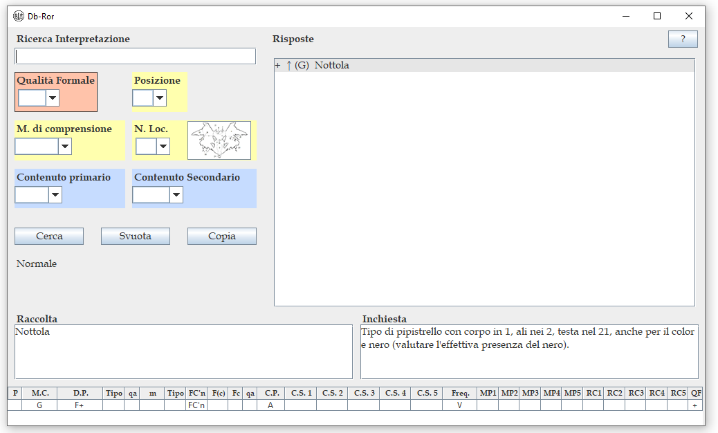 Questa funzione, consultabile rapidamente durante l’immissione di un protocollo Rorschach, consente di verificare mediante vari criteri di ricerca tutta la siglatura di una specifica risposta, primariamente qualità formale e originalità.